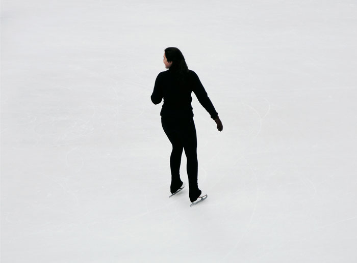 You carried sharp blades on top of white shoes, delicate lace up like in the old days boots, and you only put them on outside. Sissies put them on inside, he told you and since you and he were not that you sat on the bench outside, and went over the blue line, of the threshold, and then you began. He liked it cold and he taught you to like it, although you didn’t really – it was not your nature to like extremes of temperature. But he loved it so much. He was happiest on ice, it seemed. There was a lightness to him that there wasn’t’ usually. You knew his darkness already though you were young. Here he was released into something like freedom, and that freed you up too. Because you wanted him to be free. Because you knew he had freedom and lightness in him. Which meant you had it. Which meant there was hope for the two of you.