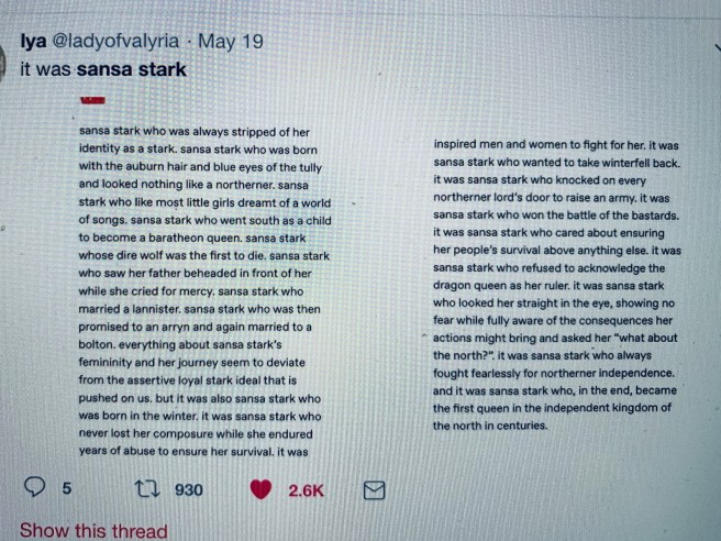 Not all of us can fight. Some of us are just too fem, too elderly, differently abled, or we just don’t want to. But what emerges from the very problematic last two seasons of GoT and the entire series with its gratuitous tits and killings spattered throughout (oh my god, that banal sadist Ramsay Bolton… oy, that writing) is the affirmation of Sansa Stark. Our Sansa. And that looking good and being smart by reading the room and studying others and trying to learn how to do this thing called politics, do this thing called power – that’s an important thing.